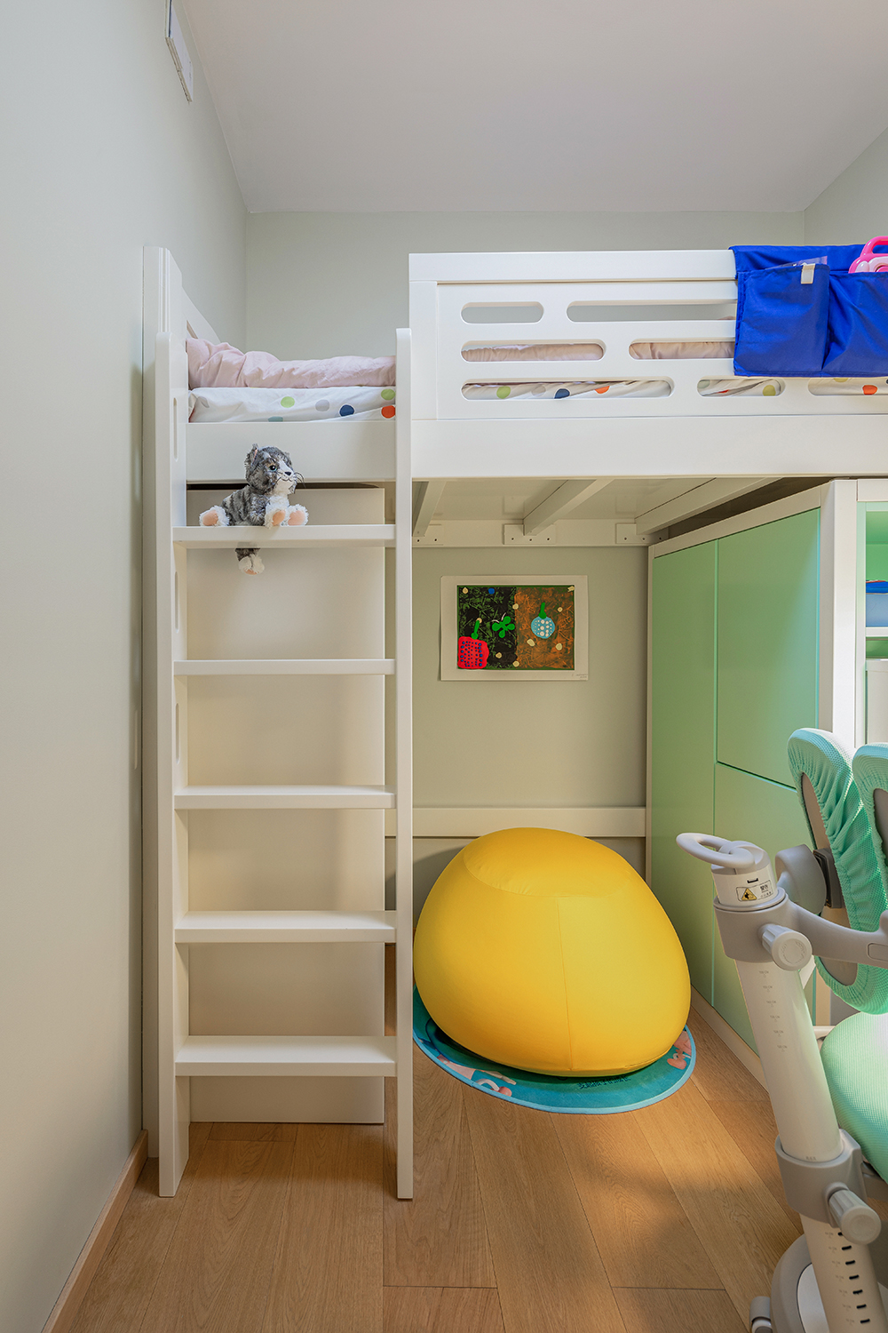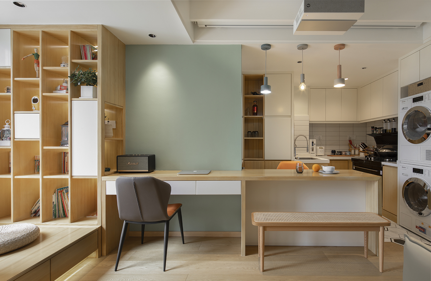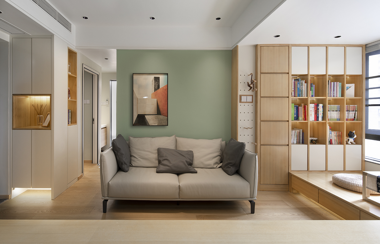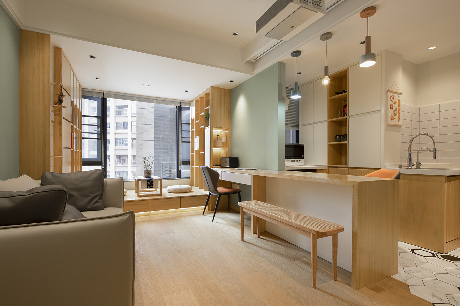 本案为三口之家改善户型。利用户型优势,将厨房做成开放式结合餐厅功能形成功能多元化的趣味就餐空间。阳台空间改造成公共区域借开放功能增大空间感。家是生活的一部分,和业主反复多次磨合后最总定稿了现有的大色调,淡绿基调融入原木碰撞彰显主人低调不失高雅的品味。满屋地板为空间增添几分恰好的温度。